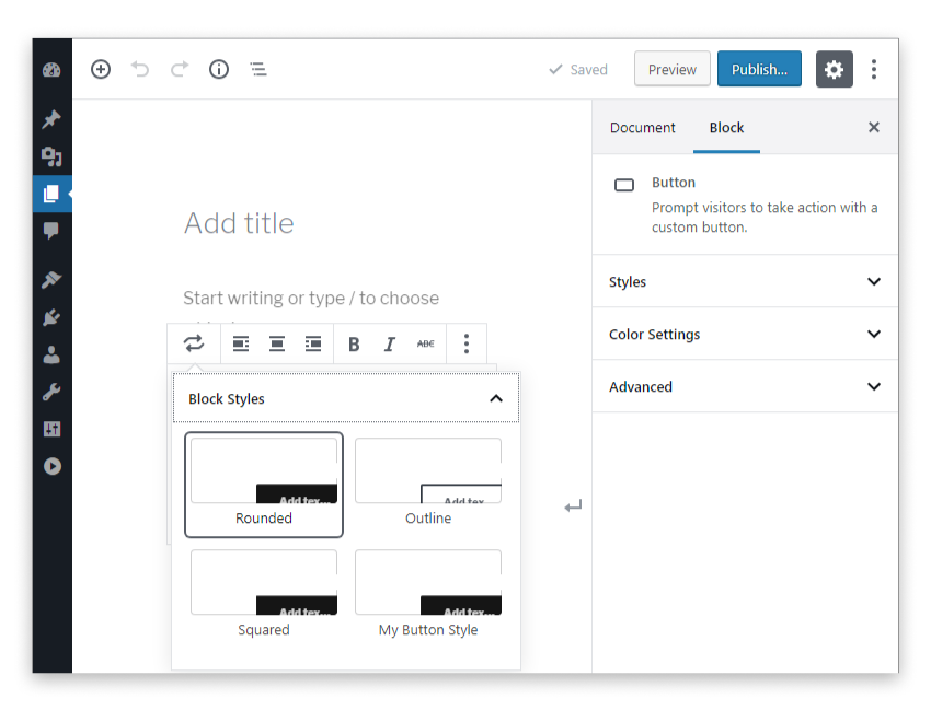 Los estilos de bloque están diseñados para alterar el aspecto del bloque. De hecho, un estilo de bloque es una forma elegante de agregar una clase personalizada a un bloque usando las opciones de bloque en el editor de publicaciones.