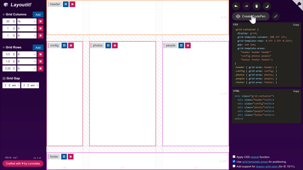 Cuando haya terminado con un diseño, puede crear un CodePen o tomar el código para impulsar su próximo proyecto. La herramienta pone el código en primer plano, ayudándole a aprender la cuadrícula CSS mientras trabaja directamente con ella.