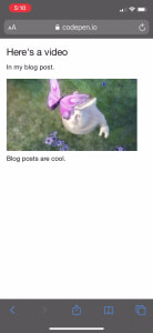 video src="..." controls playsinline/videoLos navegadores móviles reproducirán el vídeo justo donde está en lugar de hacerlo de forma predeterminada, que es abrirlo en pantalla completa mientras se reproduce.
